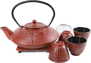 Cuisiland トンボ 鋳鉄ティーポットセット カップ4個付き 36オンス レッド